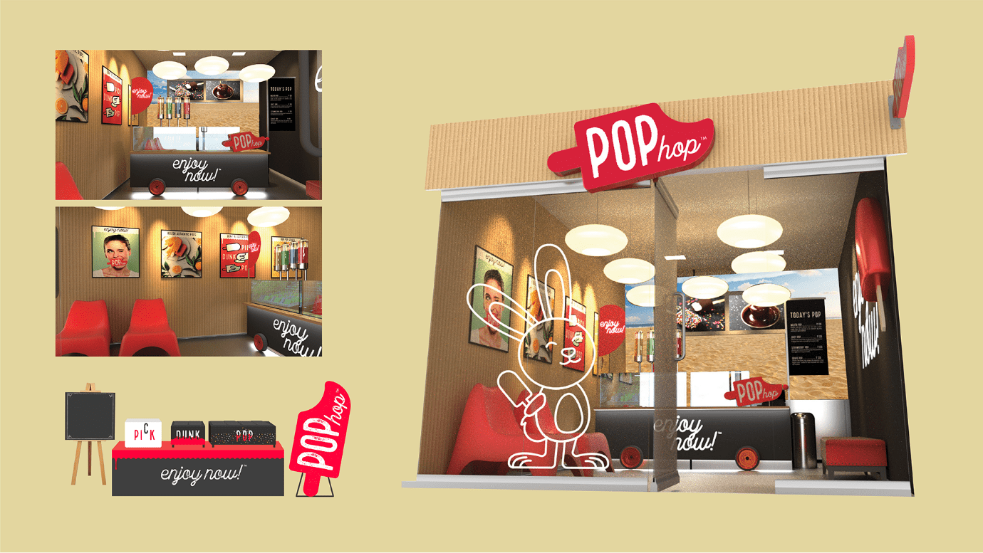 Pop Hop removes the guilt, celebrates the spontaneity of having a naturally artisanal fruit-infused popsicle. The service experience is immersive, designed as three simple steps: pick, dunk, pop, to prolong the moments of joy.